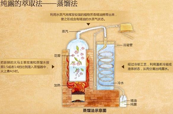 ②制作方式:纯露的制作方法是蒸馏萃取法,将新鲜的植物和蒸馏水按照比列放入蒸馏容器中,高温加热,在蒸馏的过程中,水油分离,精油浮在表面,下方就是沉淀的纯露。