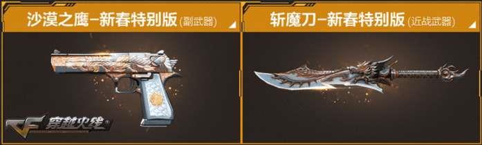 这一次新春豪礼还是紧贴沙海生存新模式,首先是沙海生存主题的两把永久武器,一个是沙漠之鹰-新春特别版(副武器),另外一个是斩魔刀-新春特别版(近战武器),这两款永久武器不是花钱买的,而是用游戏内的金币就可以购买,而且价格也是非常便宜,除此之外还有其他多款新春贺岁武器上线,让整个CF穿越火线端游变得喜气洋洋!
