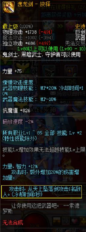 逸龙剑抉择可以说改版后作为圣耀之下第一选择的史诗巨剑。1-85级的技能增加2级,12%的力智,20%的追加黄字。
