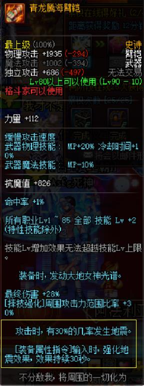 青龙腾海臂铠是一把被称为"挂"的武器,地震伤害是所有武器中特效伤害最高的一个,拥有这一把武器搬砖只需要跑步就行了,并且可以靠这一把武器让圣物套乌鸡都能刷过魔界裂缝,虽然特效强杀吞噬魔比较慢,但是不可小看他作为目前版本最强的特效攻击武器。