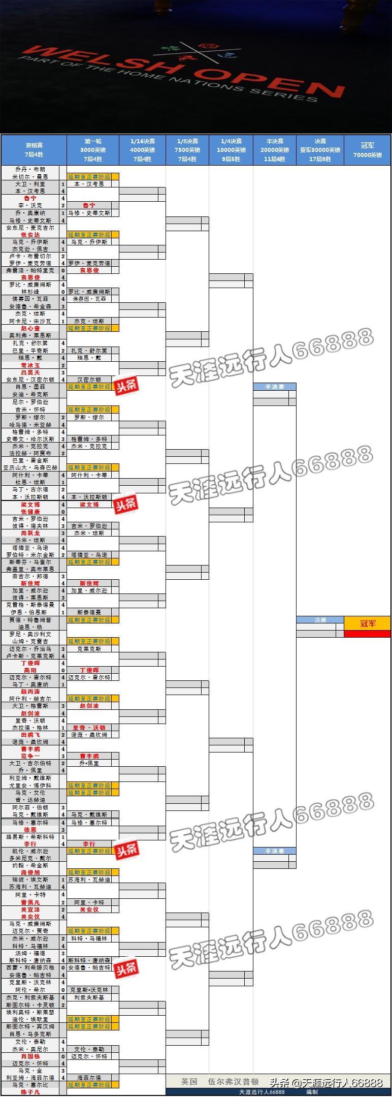 斯诺克威尔士公开赛正赛赛程+对阵签表,小赵、小颜携手小丁冲冠