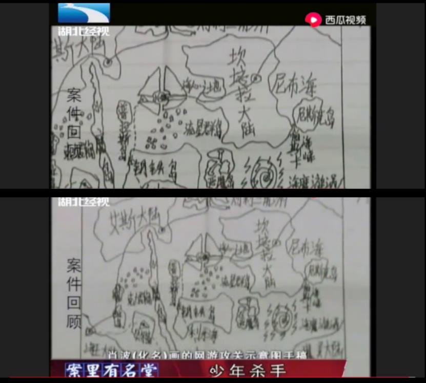 另外,哪怕是在他所沉迷的游戏方面,也凸显了他细心缜密以及极具绘画才能的一面;记者在其书包内,找到了一张肖波自己画的,关于网游攻关示意图手稿,山川河流,千军万马,跃然纸上;
