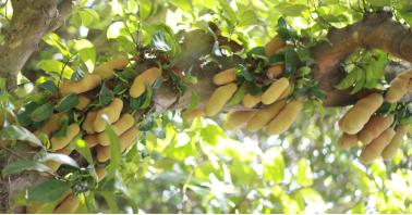 尖蜜拉,又名小木菠萝,外型和菠萝蜜相似。果实果瓤中包着几百个淡黄色的肉包 ,其味极甜如蜜,香味浓郁,较菠萝蜜浓,有点象榴莲,果核心还可炒吃或煮吃,味似板栗。