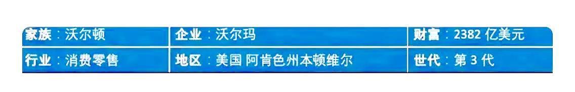 沃尔顿是全球收入最大的零售商,全球10500多家门店的销售额为5590亿美元。沃尔顿家族拥有这家零售商48%股份,成为这个世界上最大的财富基石。