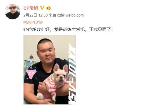 各位粉丝们好,我是训练生常旭,正式见面了!海报中除了常旭本人,还有他的宠物一只奶油色法斗。有粉丝调侃:狗或者人,到底是哪个要出道了?