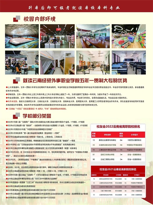 云南经贸外事职业学院是云南省五年制大专办学最早、规模最大、专业最全、校园最美的大学之一,被政府评为“云南省特色骨干高等职业院校、云南省优质高职院校建设单位、云南省管理水平提升行动计划高职院校管理15强、云南省八个示范性职教集团之一、云南省职业院校现代学徒制试点单位”等。