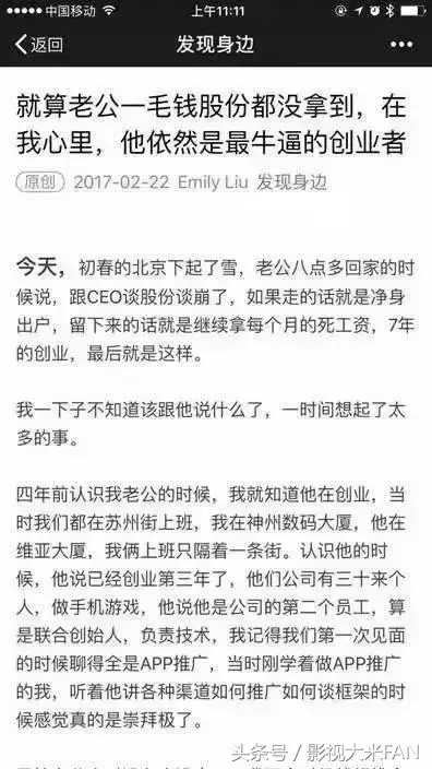 近两天一篇《就算老公一毛钱股份都拿不到,在我心里,他依然是最牛逼的创业者》刷爆朋友圈,本以为就是一篇主人公Emily Liu给老公的求职信,但是一直到今天这件事持续发酵,这其中错中复杂的关系也被曝出来,七嘴八舌,简直不要太热闹。