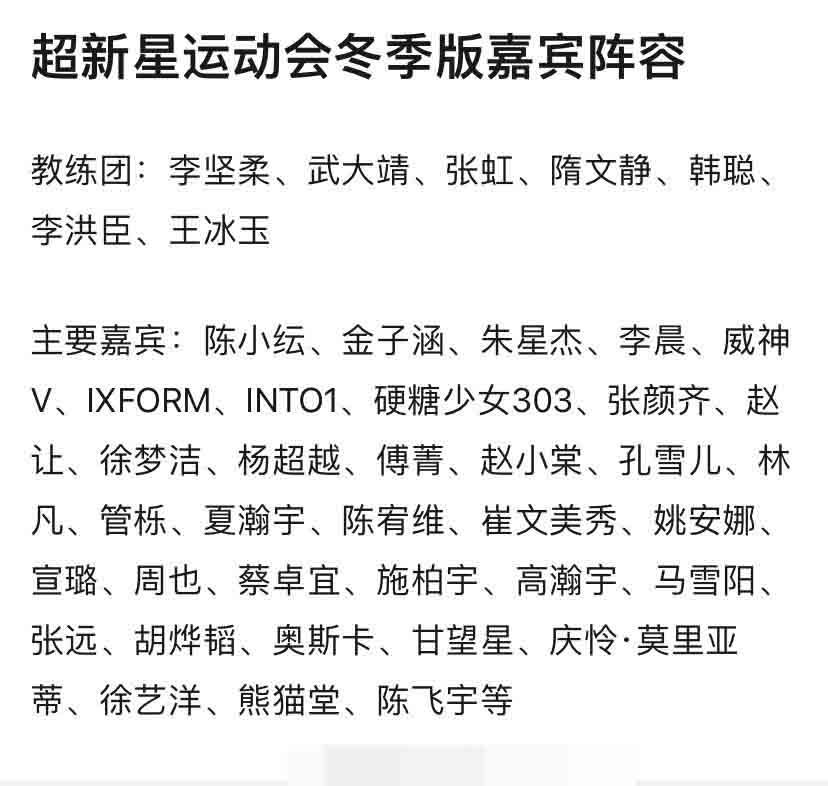 看看这个参加名单,其实你会发现都是老熟人了,按照超新星全运会以往的管理,参加超新星全运会的人基本上都是爱豆,而参加超新星全运会的新人基本上都是这一年出道的新爱豆,其他的都是以前就会参加超新星全运会的爱豆,不少爱豆都是连续参加过好几届超新星全运会的人了。