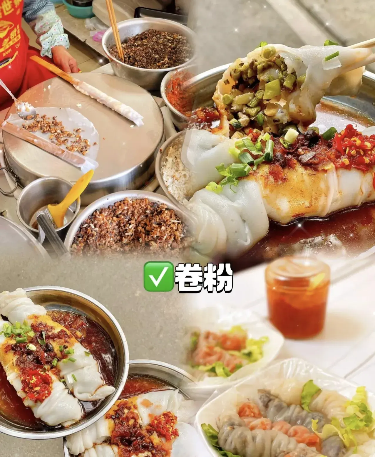 纯手工制作的粉皮十新鲜的肉料,保证了肠粉鲜甜口感,加上一小勺独家秘制灵魂辣椒酱!好吃到“跺脚“,正点~