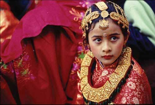 当然,尼泊尔的"活女神"除了美貌纯洁外,还必须具备智慧尊严和美德,在检验时必须同杀来祭祀用的羊头和水牛头共处一室,度过一夜,并且不发出任何尖叫和惧怕之情才能通过测试。