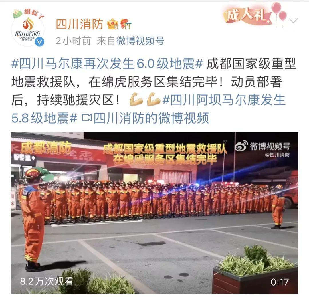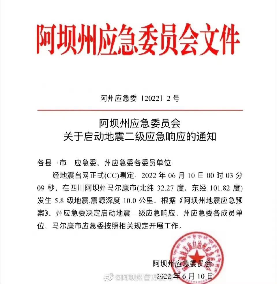 凌晨1时43分,@阿坝州官方发布 通报称:根据《阿坝州地震应急预案》,州应急委决定启动地震二级应急响应。