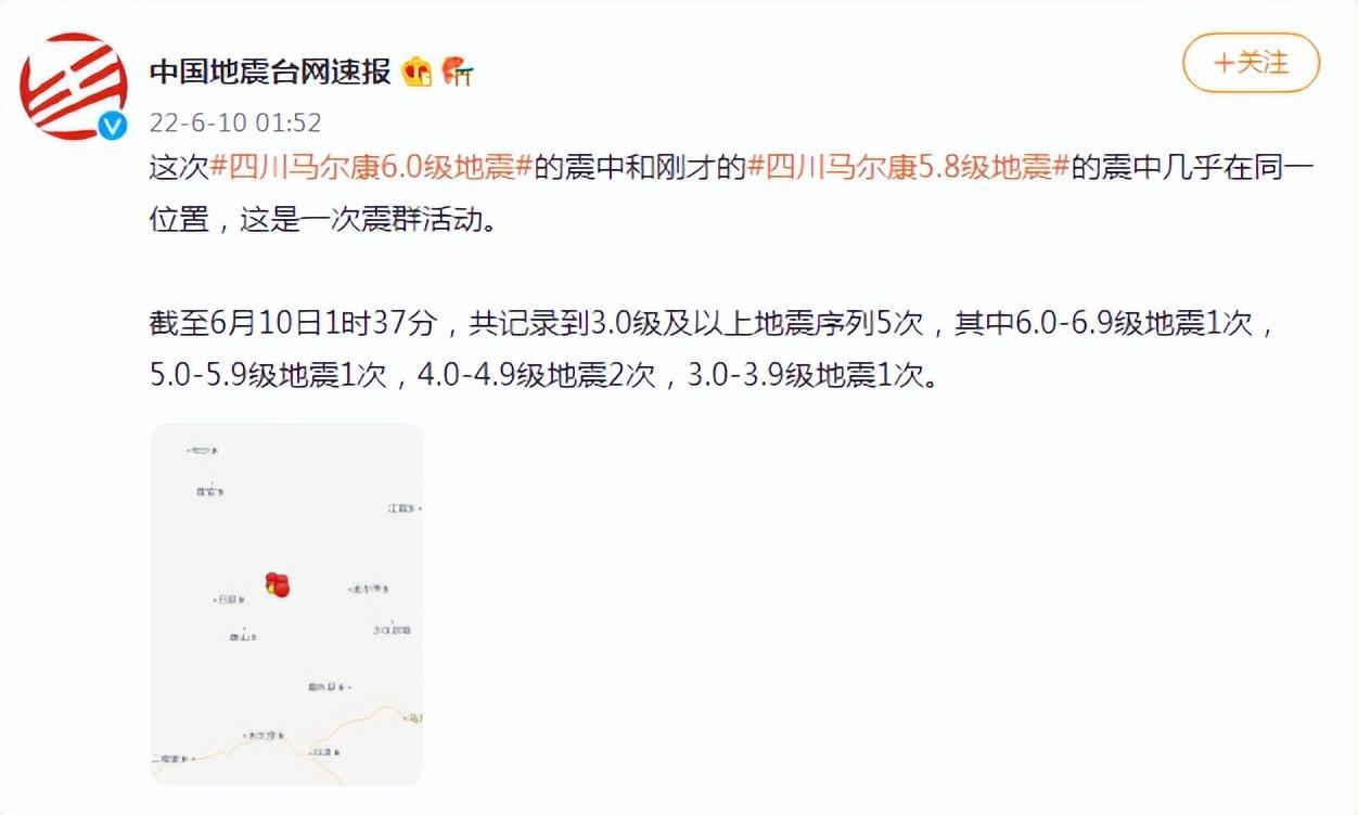 其间,@中国地震台网速报 表示,1时28分正式测定的6.0级地震与此前发生的5.8级地震,震中几乎在同一位置,是一次震群活动。