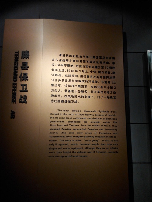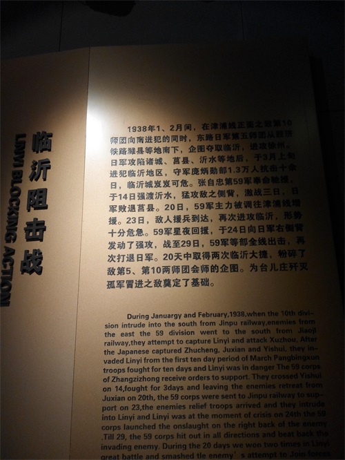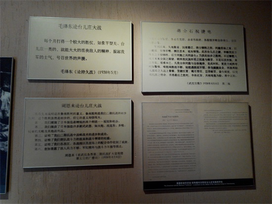 一九三八年春,日军坂垣师团自胶济线南下,直逼临沂,矶谷师团沿台枣支线挺进,欲速取台儿庄以南的徐州贯通津浦线。坐镇徐州的第五战区司令长官李宗仁以孙连仲部防守台儿庄,在以台儿庄为中心的鲁南地区进行了一场大规模的惨烈战役,这场战役,历经月余,歼敌万余,创八年抗战之伟绩,扬中华民族之雄威。