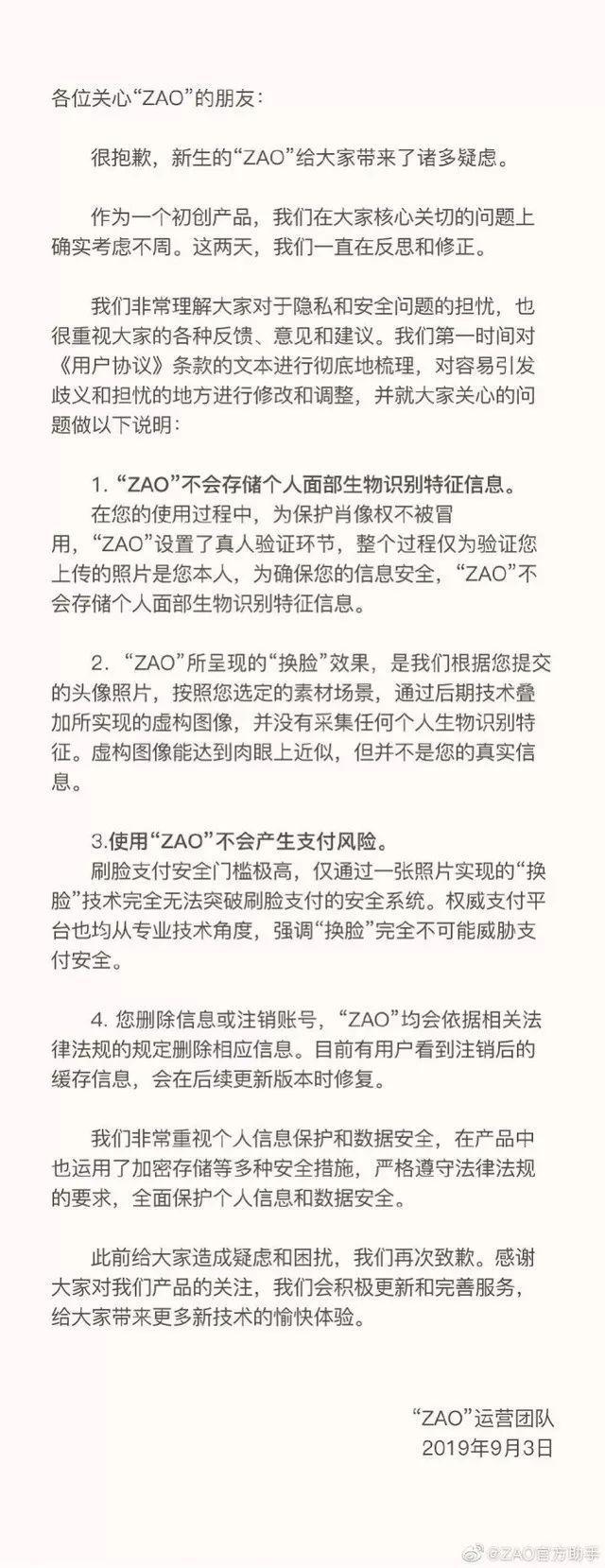 9月3日,针对涉嫌过度收集用户信息和隐私安全等争议,AI换脸软件“ZAO”运营团队发布声明表示,软件不会存储用户上传的面部生物识别特征信息,强调“换脸”不威胁支付风险。南都记者留意到,目前“ZAO”再次修改了用户协议,新增了“特别提示”,新用户需“已阅读并同意用户协议”才可注册。(南方都市报)详情 >>