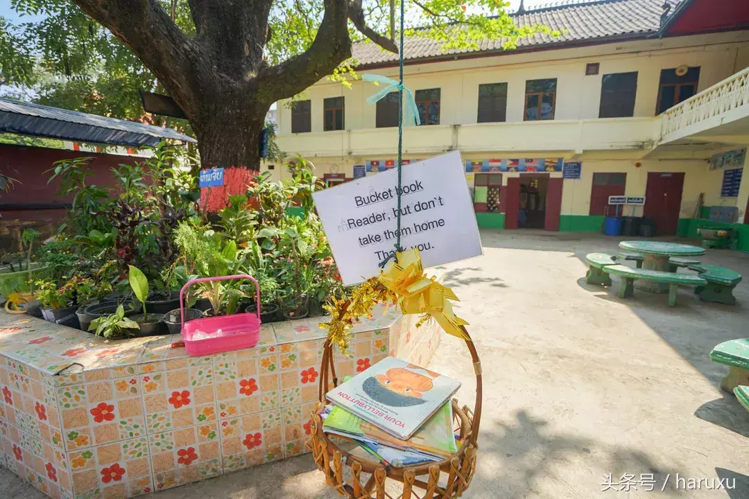 大树下居然挂着一个书蓝,里面是几本绘本,牌子上还用英文写着“请勿带走”。