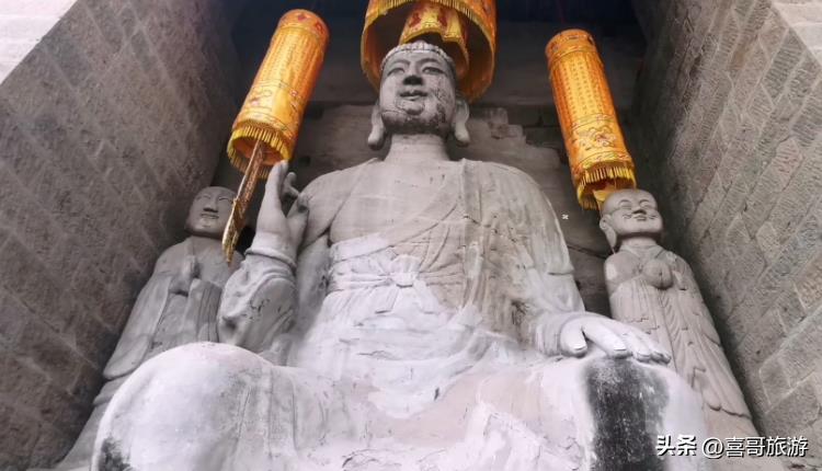 弹子石大佛,位于重庆市南岸区弹子石街道,高达7.5米的大弥勒佛像,俗称“大佛”。大佛摩崖造像开凿于元末,背东向西,依山雕凿。佛龛高10.6米,宽10.14米,深2.8米,岩石为黄色砂岩。面对东逝江水,站在“大佛”处可远眺朝天门与江北城。在以往交通不发达的时候,乘船沿江上溯重庆,望见“大佛”便是抵达重庆的标志。每到春夏江水上涨时,“大佛”的佛脚浸入水中,民间便用“大佛洗脚”“大佛洗手”“大佛洗脸”来形容长江水位的变化。长此以往,“大佛”已成为一代代重庆人心中独特的文化印记。“大佛”的正式名称为重庆市南岸区弹子石摩崖造像,主要包括大弥勒佛(“大佛”)及二弟子造像一龛、三坐佛及二弟子造像(“五佛”)一龛。