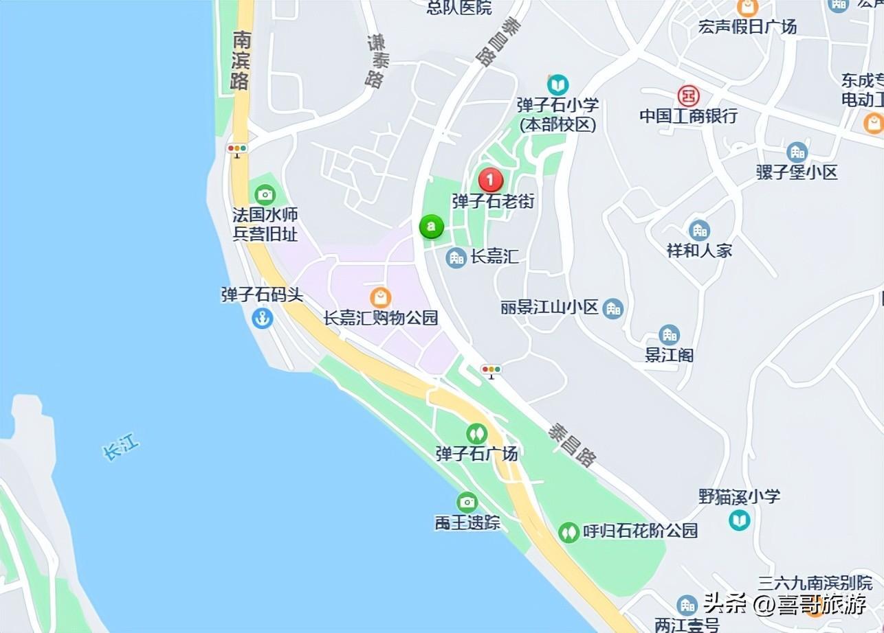 弹子石老街,是连接朝天门码头的重要通道,南起南滨路王家沱码头,从南滨路起始,沿弹正街1号拾级而上,直至弹子石转盘街口,主街道全长近1000米,高差达近80米,占地面积12万平方米。穿梭于川东风格的街巷院坝,沿途可观星罗棋布的吊脚楼商肆。