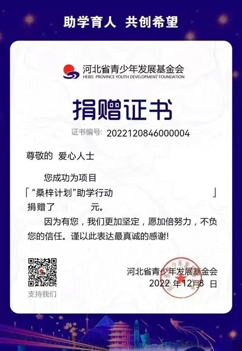 募捐活动参与方式 捐款可以个人/集体名义,扫描识别下图二维码即可参与助学活动。参与完成后,由河北省青少年发展基金会自动生成捐赠证书,可在冀青筹公众平台“我的”中查看历次捐赠证书。企业参与可最高抵扣15%税款,同时获得省级颁发证书,并由冀青筹平台邮寄。