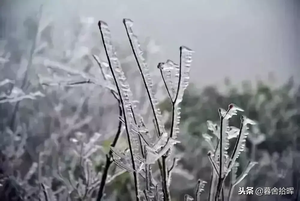 树枝上挂满银条、栏杆上结着冰挂、