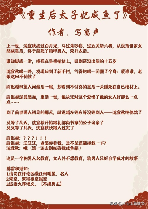 男女主是双重生,女主重生后不再想拼事业了,也不想入宫了,就想做一个咸鱼,可是没想到男主硬是把她推上了太子妃之位,男主重生之后确实也是个好男人,关于女主对他冷淡,他也是从自己身上找原因。