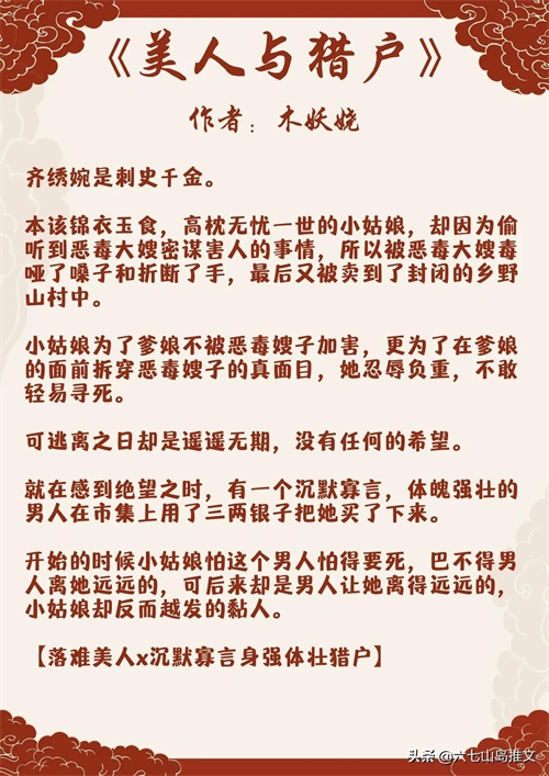 这是一本种田文,女主是落难的娇弱美人被身为猎户的男主买了下来,本来女主以为自己此生可能凄惨度过了,没想到猎户竟然会友好对待她,还帮她处理伤口。