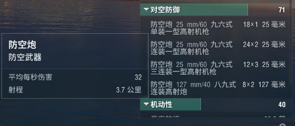 防空方面就体现出小日本的特色啦(什么特色?当然是九六神炮啦),中圈清一色的25mm九六炮,看着多,伤害不咋样。外圈由127炮组成,秒伤81,看到都哭了。天城防空大概什么情况,对面七八级航母两组飞机过来,进防空圈后两三秒能够打下来一架,运气好能打两架,投完弹能打一两架,要是九级十级航母,直接给你个毁灭打击。