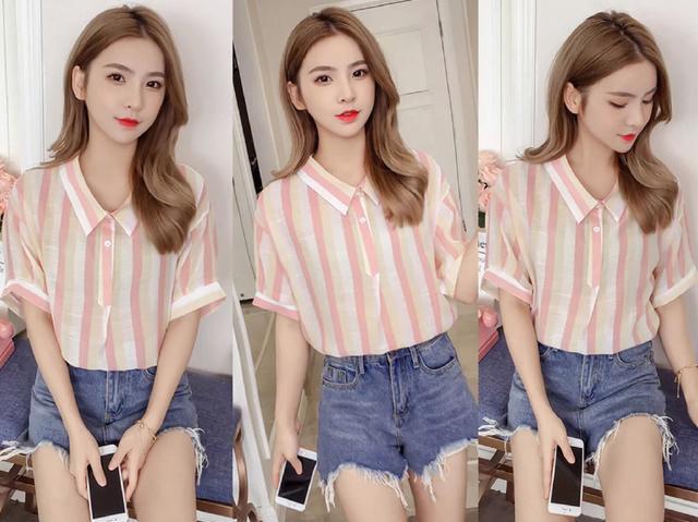 亚麻色的系列中,亚麻金色是比较潮的一种发色,染过后会比较抢眼,有点偏金色的长发,带给人一种很时尚又酷酷的感觉,可以提升人的肤色亮度,超级显白,用烫发的技术,烫成有点卷的发型也很美,把一侧的刘海放下遮住一点脸部,也很显脸小,搭配条纹的衬衫和牛仔短裤很时髦又清凉。