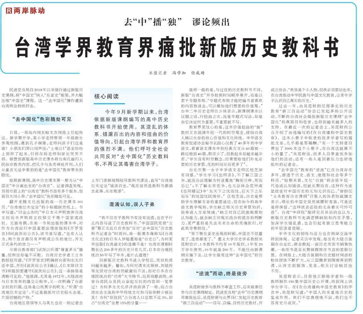 自民进党上台以后,大肆修改教科书,企图从青少年儿童开始培养“台独”分子,分裂祖国