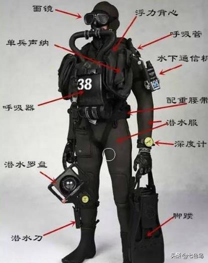 蛙人装备是功能先进、花样繁多。主要有:潜水装备、单兵武器、通信装备、导航装备、侦察装备、水下辅助工具、交通工具等七大类。