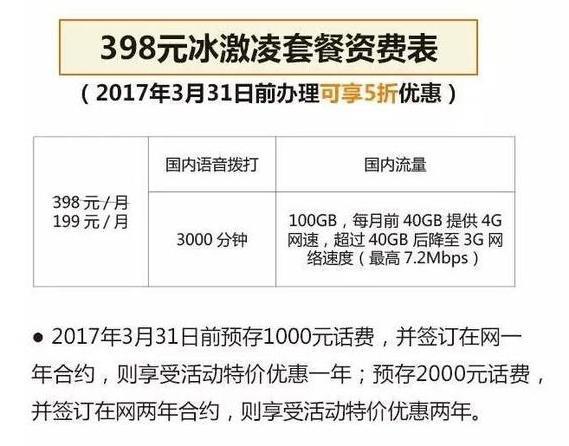 根据互联网上的资料,冰激凌套餐原价每月398元,存2000元优惠2年,存1000元优惠1年,优惠期内为199元。包含3GB国内流量、37GB省内流量,3000分钟的国内通话。