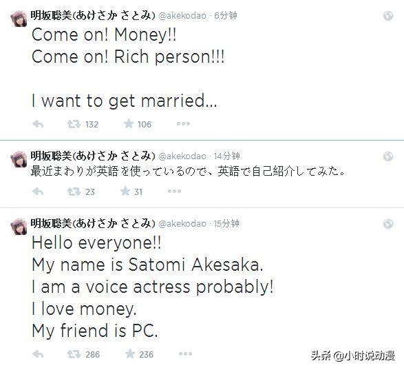 不过对声优界接二连三的婚讯,也不是所有人都抱着祝福的。著名“恨嫁”女声优就在自己的推特上狂发“灾害之词”。虽然她用了最近初学的英语发推,但字里行间还是能看出她的不甘心和不情愿。而日本的网友们也不负其所望,一出又一出的迫害“小明”(明坂聪美)的好戏开始在推特上轮番上演,真是悲惨至极。