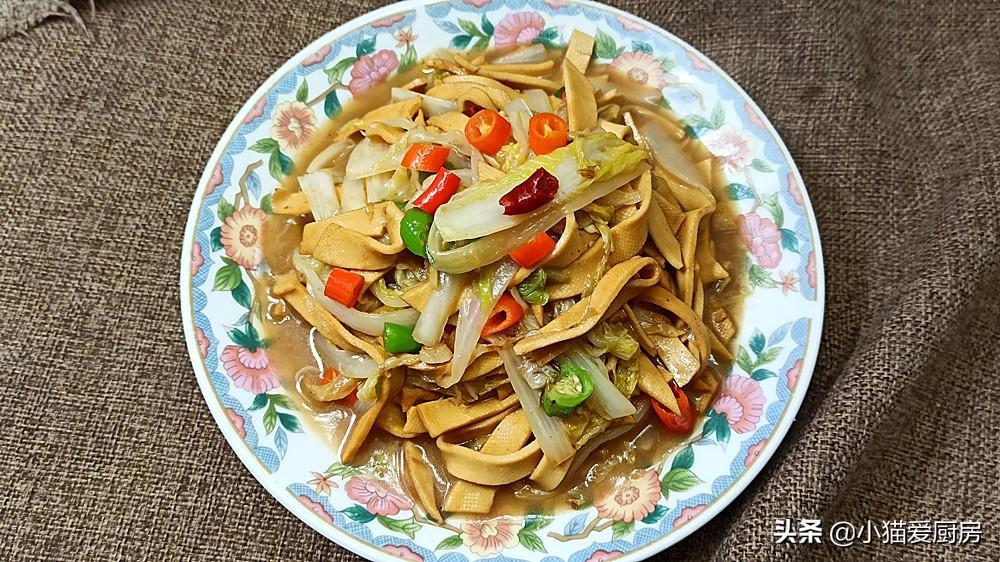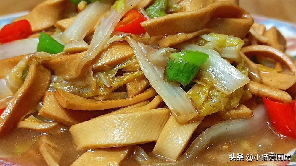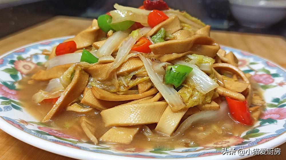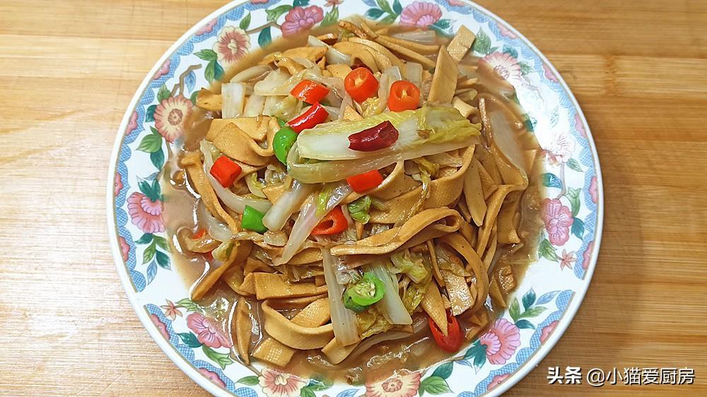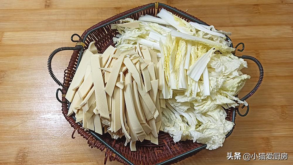 白菜是我们冬季经常吃的家常蔬菜,大白菜含丰富的维生素、膳食纤维和抗氧化物质,冬季经常吃些大白菜能促进肠道蠕动,帮助消化。白菜容易储藏,而且价格实惠,而且可跟很多菜肴搭配,是名副其实的“平民菜”和“百搭菜”。而干豆腐是我们经常吃的豆制品,干豆腐有的地方叫:豆皮、千张、豆腐皮等,其营养丰富,含有丰富蛋白质,含有多种矿物质,补充钙质等。