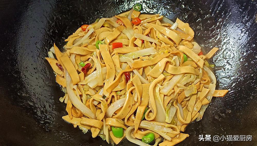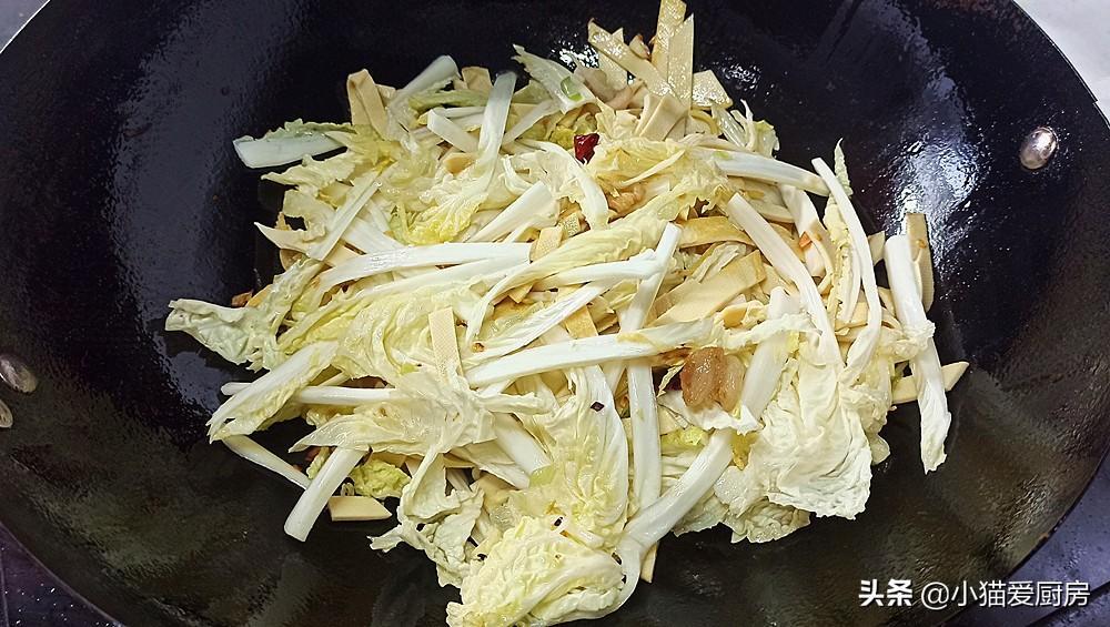 (1)干豆腐要先炒1-2分钟,主要是把干豆腐的豆腥味炒掉,白菜也要先炒软,用以去除白菜的生涩味道。