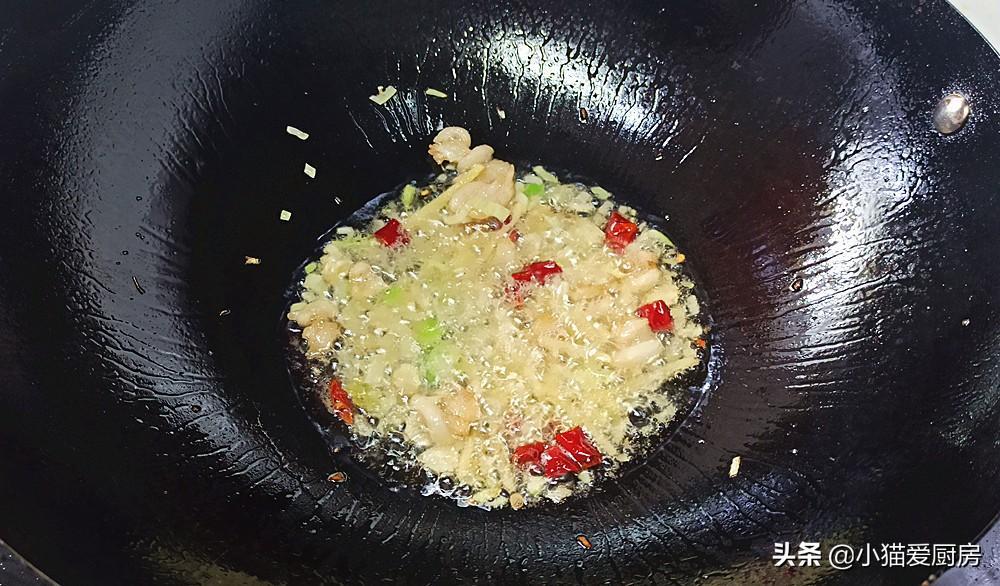 【步骤四】:肥肉油炒出来后,把姜、葱、蒜、干辣椒倒里边,开小火炒香。