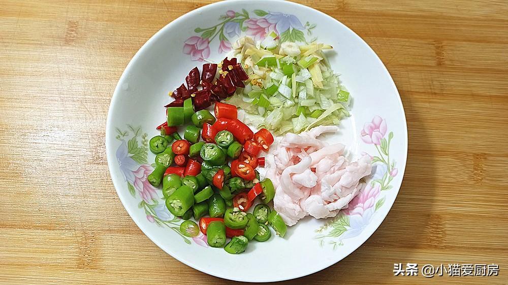 【步骤二】:把生姜切成丝、大葱切成葱花、大蒜切成颗粒、干辣椒切成小段、青红辣椒切成圈、肥肉切成小块;然后分别装盘备用。