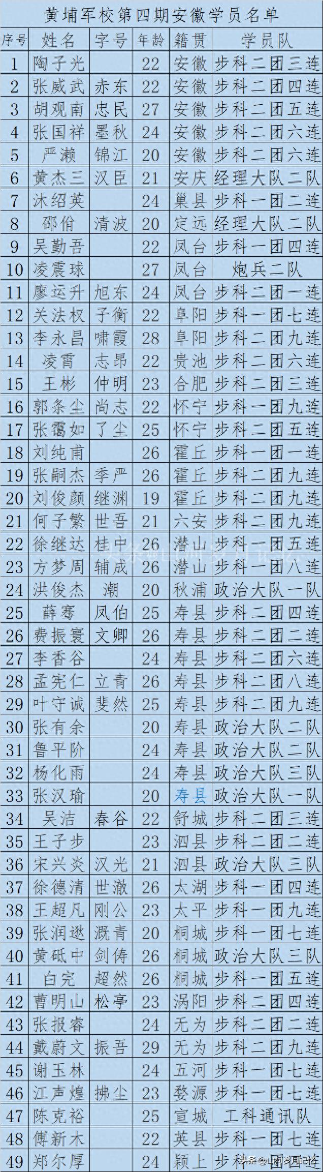 黄埔4期安徽学员网上能查到信息的还有:寿县小甸集人鲁平阶,泗县人王子步,太平人(今黄山市黄山区)王超凡。因查询简单,难免有疏漏,如果网友知晓4期其他学员情况的,请在评论区留言。