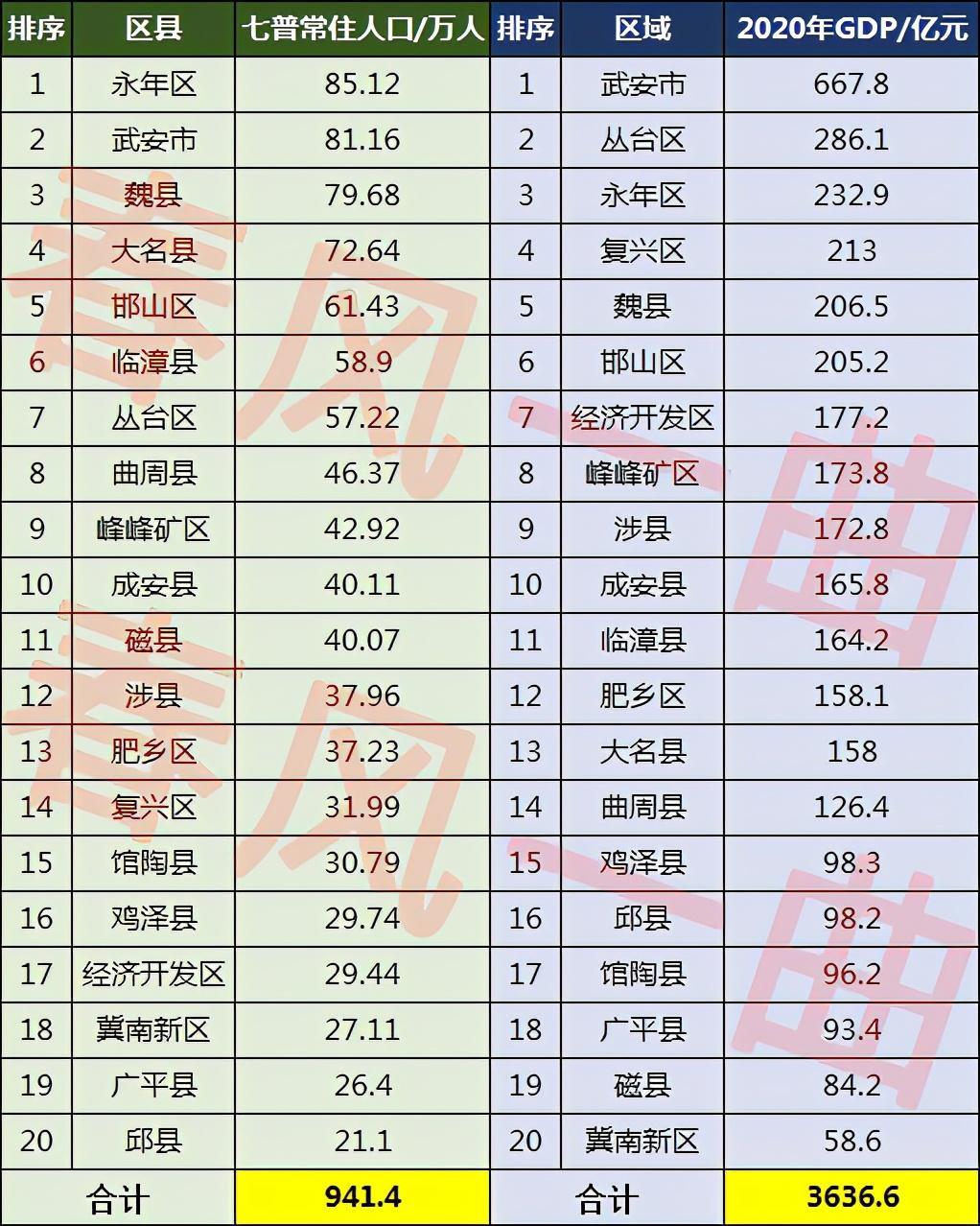曲周县常住人口为46.37万人,峰峰矿区常住人口为42.92万人,成安县常住人口为40.11万人,磁县常住人口为40.07万人,涉县常住人口为37.96万人,肥乡区常住人口为37.23万人。这里六个区县中,肥乡区是邯郸市6个市辖区中经济实力最弱的区,2020年肥乡区GDP总量为158.1亿元;磁县2020年GDP总量仅有84.2亿元,是邯郸市18个行政区中经济实力最弱的区县。