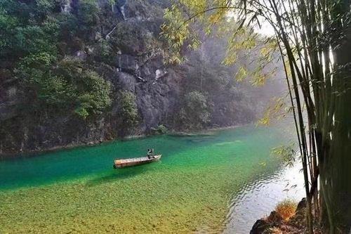 一望无垠的湖面上载着一页小舟,穿梭在山水环抱的湖面上,感受动静结合的如画美景,时而缓慢,时而轻快,船在水上漂,人在画中游的意境,有一种“轻舟已过万重山”的飘飘欲仙,飘飘悠悠的感觉。沿途低矮的山丘,重重叠叠,连绵起伏,蜿蜒曲折,绿树成荫,青翠欲滴,泛着绿光…湖光山色,山水云天,烟雨朦胧,飘飘渺渺,如梦如幻,,人在画中游,山在飘渺间的诗情画意…