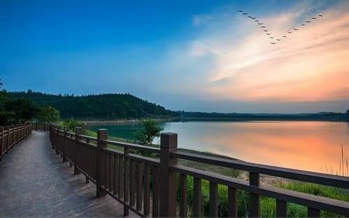 远处水鸟欢飛,时高时低,拍打着翅膀,舔着这多情的湖面,玩水嬉戏,在风平浪静的湖面上照着镜子……叽叽喳喳的打破湖面的宁静,唱着婉转动听的歌…