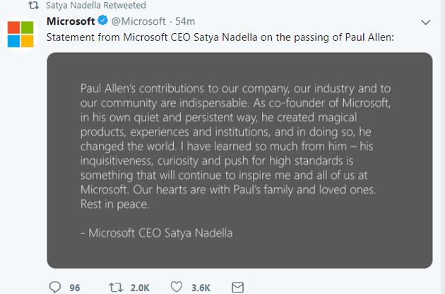 现任微软CEO萨蒂亚·纳德拉表示,艾伦为微软和科技行业做出了"不可或缺的"贡献。纳德拉还表示,他从艾伦那里学到了很多,"作为微软的联合创始人,他以自己的安静和持久的方式,创造了神奇的产品、经验和制度,他改变了世界。"