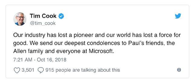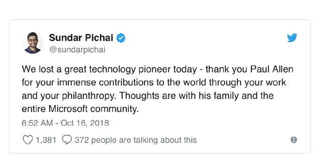 Google CEO皮查伊(Sundar Pichai)称,艾伦的去世意味着世界失去了伟大的技术先驱。