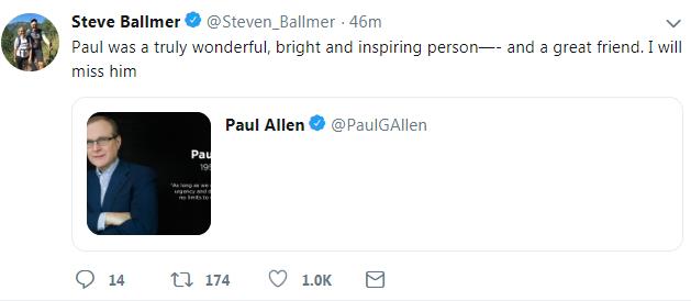 微软前CEO 鲍尔默(Steve Ballmer)称,艾伦是一位"真正美妙、聪明、鼓舞人心的人"。