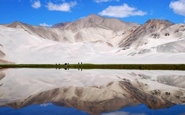 出了盖孜峡谷,见到帕米尔高原的第一面湖泊就是白沙湖,他承接了帕米尔高原东北部大部分冰川雪山融水。冬季水低石露,盖孜峡这个大风口,将河床湖沙吹起,日积月累,形成现在银沙裹挟的白沙山。风平浪静时分,沙山倒影湖中,水天一色,沙湖奇观显现。