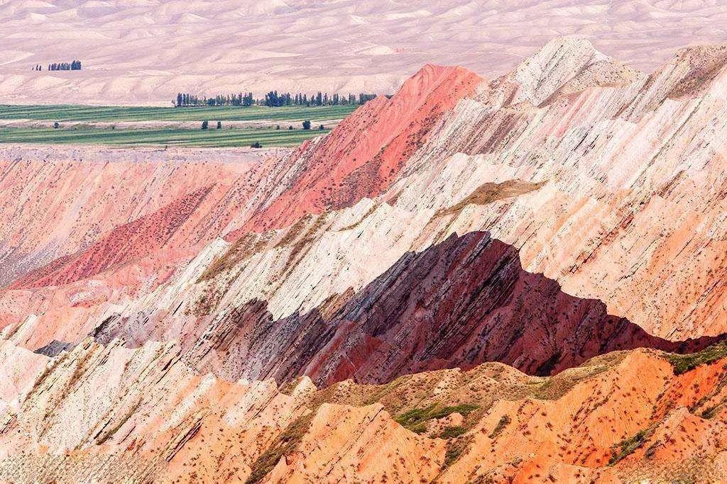 奥依塔克红山,自身透体通红,像是因为炎热而被烤红的番薯。选择自驾的路上不需要刻意寻找就能发现它,像一幅巨大的油画,走近细看拱起的山崖身披裂纹,像是人为雕刻般不真实。