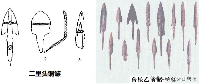 河南二里头遗址有出土我国最早的青铜镞,该遗址里的铜镞却有几种形制,一种是扁平圆叶形,箭镞的铤形状不规则。还有一种镞则是与之后较典型的有两翼且呈等腰三角形的箭镞相似,换句话说后来的这种镞基本沿用第二种,并且更精致更锋利化。此遗址里有不同形制的箭镞并存,应该不是青铜镞刚开始的阶段。河北藁城曾出土过一支完整的箭,箭长有85cm。