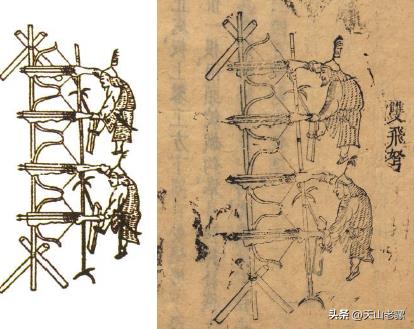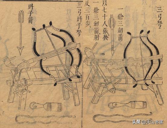 4、双子弩:《武备志》中还有一种双飞弩,先把两弩弓放在一个架子上,然后将两弩机拉弓上弦的绳索连在一起,再连到一个脚踏板上,这样一个人就可以同时控制两张弩,而且射程可达“三四百步”。