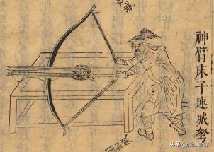 3、神臂床子连城弩:唐《通典》中有记载这种一次可发数支箭的车弩。这种弩的弩床和弩臂都比较宽,可以并排放四支弩弓,可射“二百四十步”远,威力大。