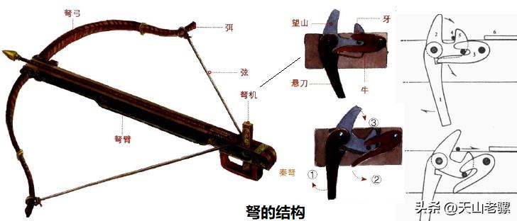 弩与弓的主要区别就是在其增加了一个控制发射的弩机,通过对战国时的实物铜弩机分析,可以找到与东汉《释名》中记载的弩机的对应结构,分别为望山、牙、悬刀、牛,还有一个铜弩郭没有找到对应结构,是因为铜弩郭是在汉代才出现。结构如下图,发射时扳动悬刀即可。《武备志》中记有两种铜弩机,一种名法古制铜弩机,一种名为改古制铜弩机,两者区别在于牛的形态有点不同,前者跟早期结构相差不大,后者牛与牙之间是曲一段曲面紧贴在一起的。