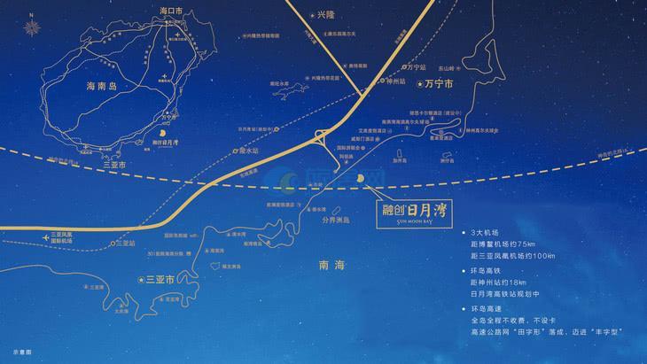 1条环岛高速: 海南环岛高速公路专门设有日月湾互通,全程不设卡不收费;日月湾互通距离项目仅1.5公里。