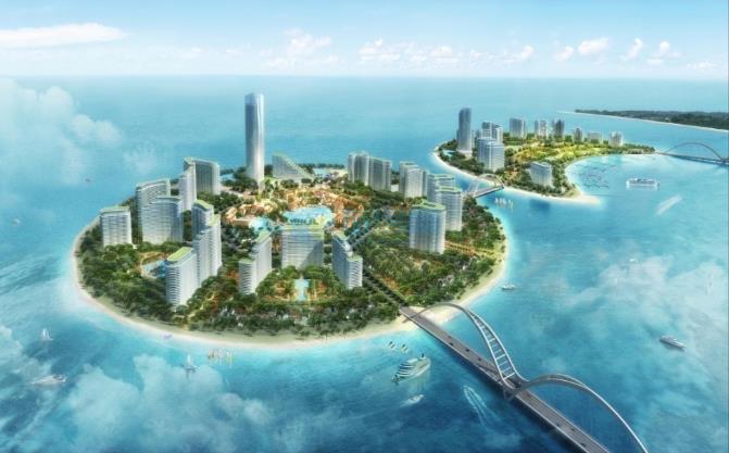 融创日月湾由两个填海岛屿“日岛”和“月岛”组成,共1492亩,月岛占地约652亩,其中日岛840亩,总建筑面积约 76 万㎡,容积率仅为 1.58,建筑密度 16.5%,绿化率高达 52%,规划将建有体育休闲中心、婚礼教堂、水乐园、五星酒店、融创传奇酒店和游艇码头等,拟打造成一个唯美、浪漫、精致的人工海岛度假区,给所有来到日月湾的人提供美好居住体验。